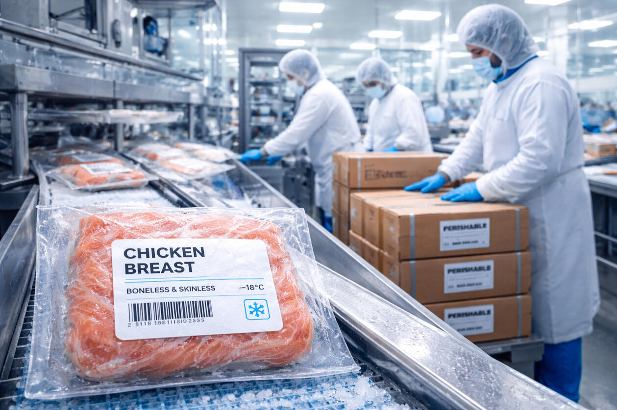Handles labeling on frozen cuts, vacuum-packed meats, and moisture-heavy processing lines